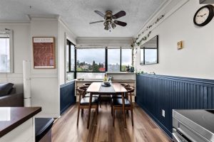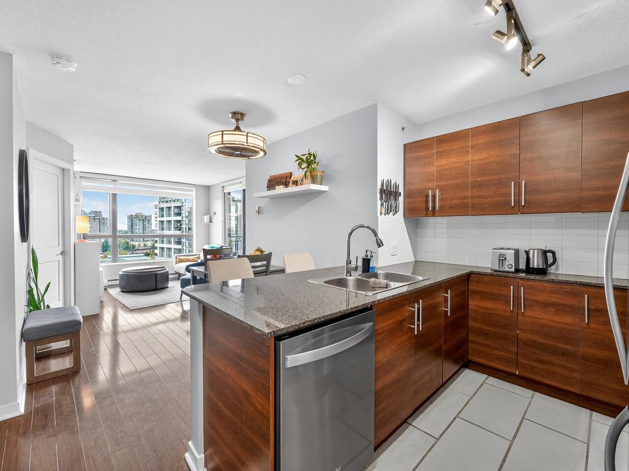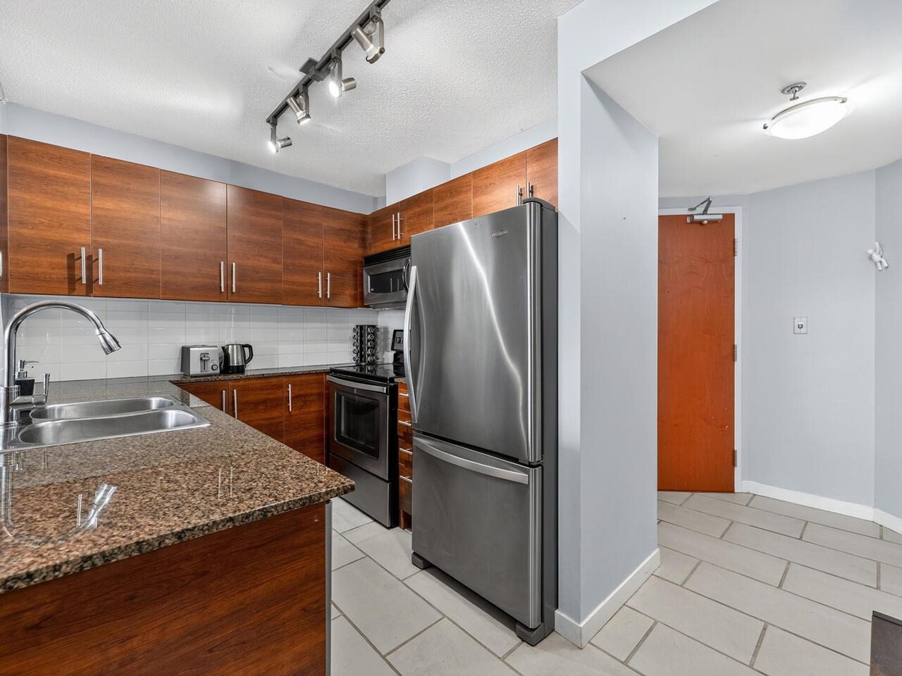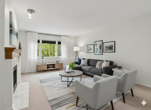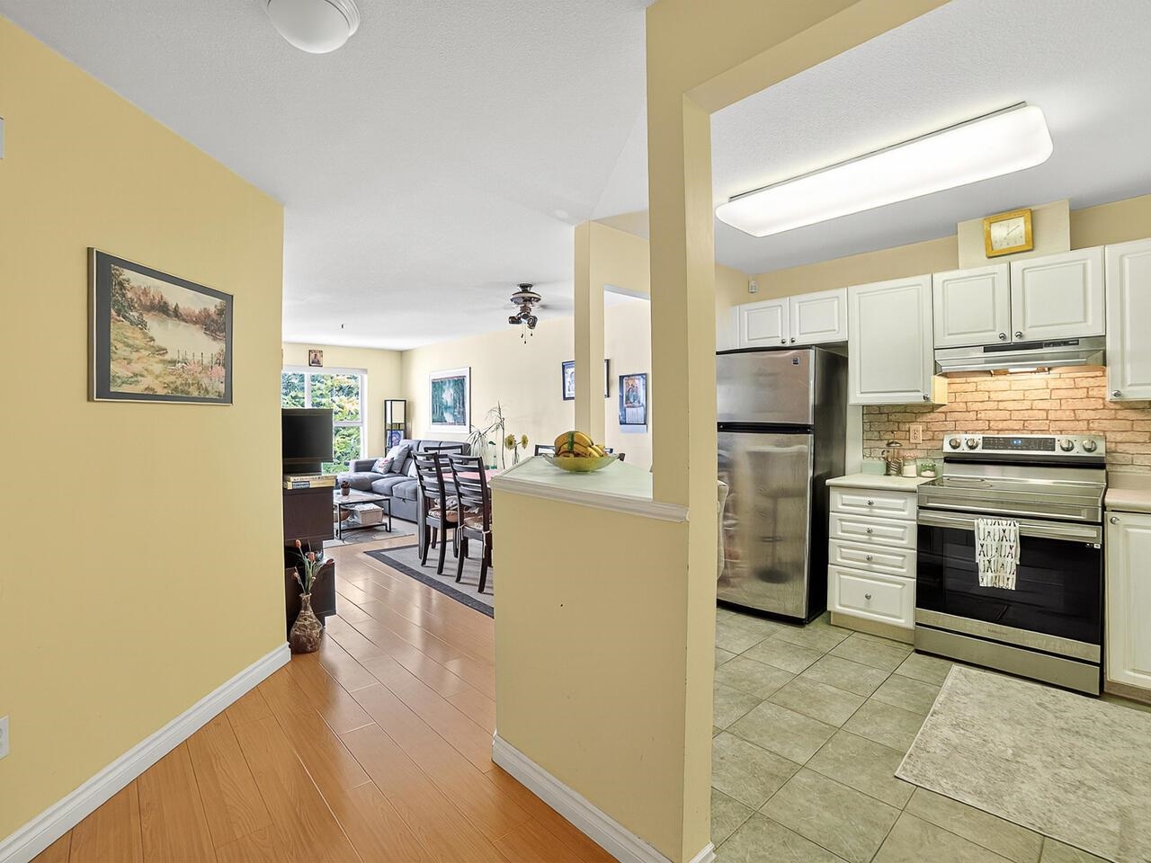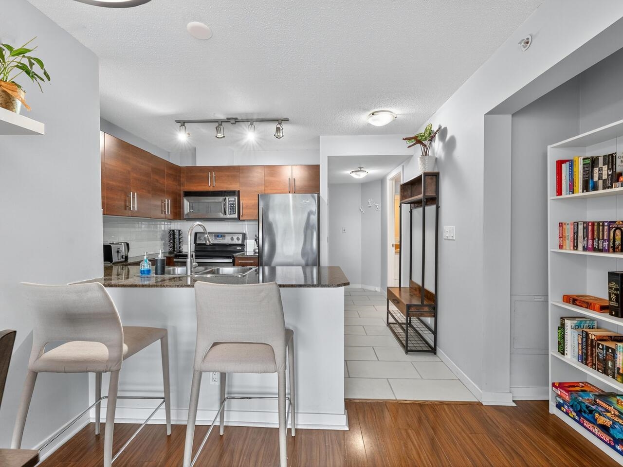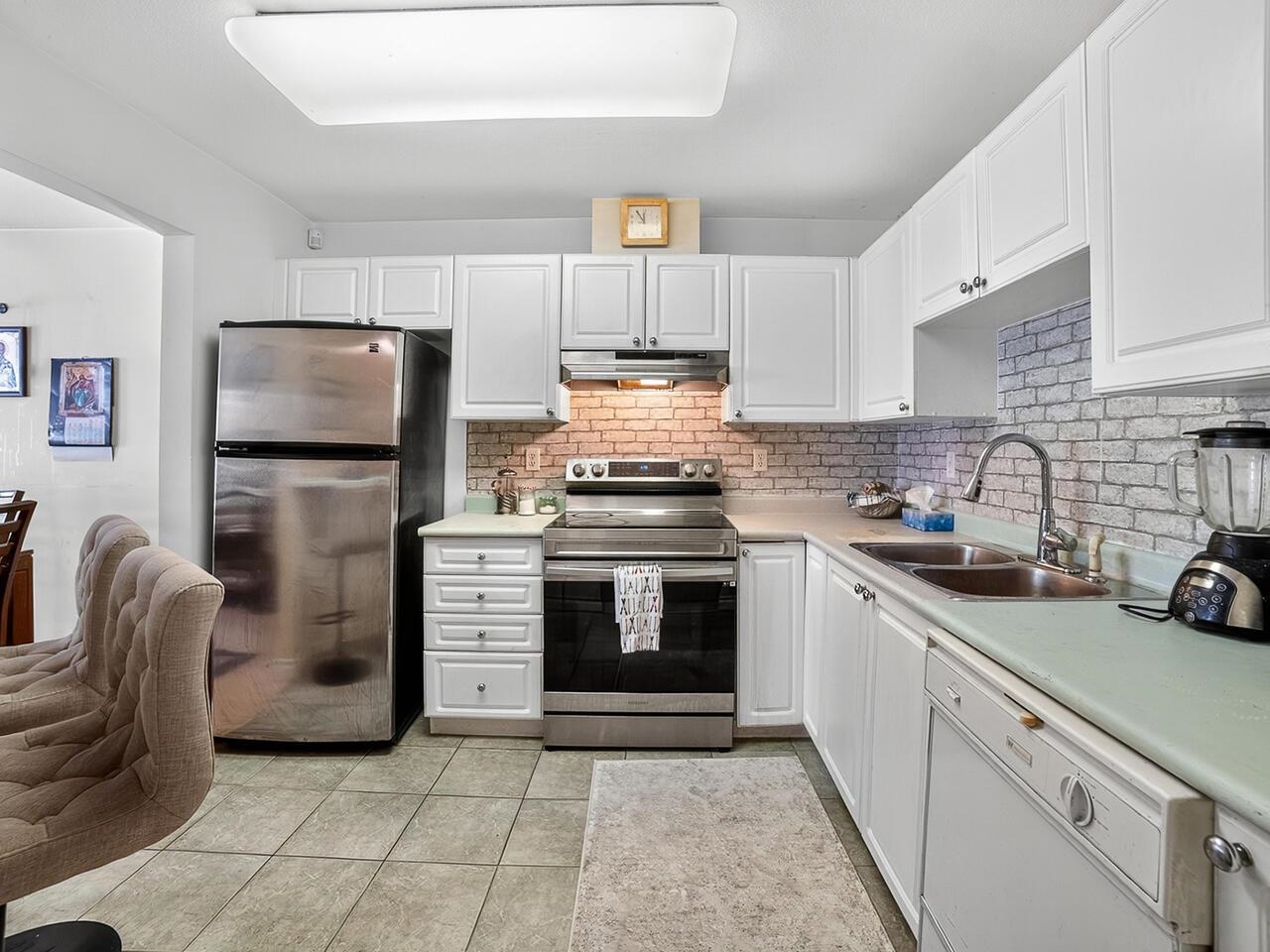 Welcome to this quiet upscale townhome complex. From your front yard gate & into the foyer with laminate wood flooring a den/office sits next to the 2 piece bathroom with a stacking washer/dryer. Steps further takes you to the single garage with parking for a second car in front. The main floor flows seamlessly between the living room, dining room & kitchen with contemporary white cabinets capped with dark stone counters to contrast the white tile back splash, all wrapped around stainless steel appliances surrounding the breakfast bar island. Sliding doors off the living room expands your warm weather living space to enjoy the treed complex. Upstairs the master bedroom takes advantage of the view over a landscaped park-like space between the buildings + a large shower in the ensuite & his/hers closets. The ample second bedroom sits at the opposite end of the home with a 4 piece main bathroom at its side. Conveniently located just around the corner from Cambridge Elementary, only a few blocks from the YMCA, grocery shopping, restaurants, Starbucks & banking + quick access to Highway 10.
