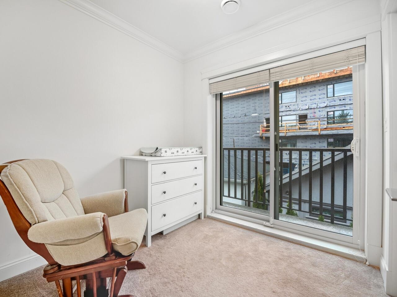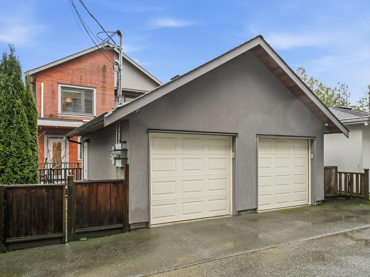 An incredible Collingwood half duplex opportunity is waiting for you. Tucked off the street, a tree lined patio leads to your front door and tile entry framed with an abundance of built-in storage before the two-piece bathroom. A quartz topped island is front and centre complementing, contemporary white cupboards and a marble backsplash over stainless steel appliances. Oversized glass, sliding doors off the living room open to a deck overlooking the patio. Crown moulding shows off the soaring ceilings with built-in speakers. Upstairs, the second bedroom has a private balcony and three piece en suite with a marble tile shower enclosure. The primary bedroom has cabinetry opposite the closet with built-ins. A deep soaker tub in the en suite sits opposite a separate shower continuing the marble tile theme. The ground floor has a self-contained studio space with a separate entrance in addition to interior access. Radiant, heated floors and air-conditioning help you maintain a comfortable home year-round. Just one block from the Kingsway corridor has you surrounded with restaurants, amenities, and transit options.