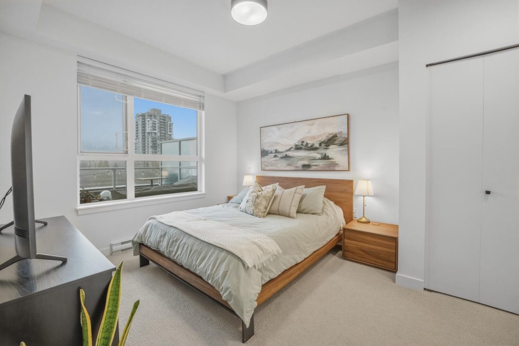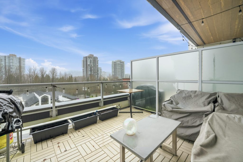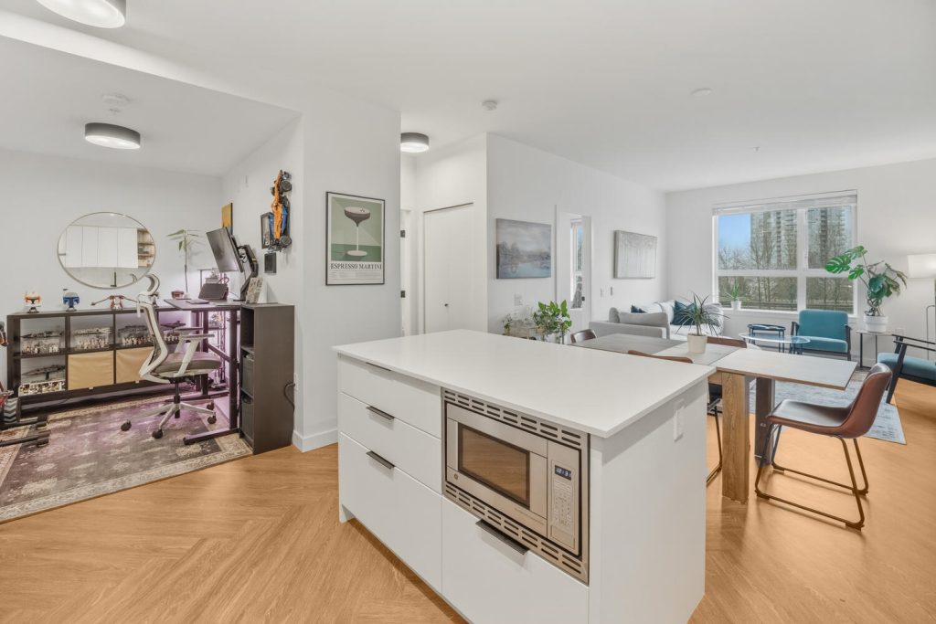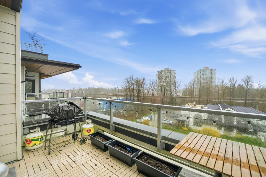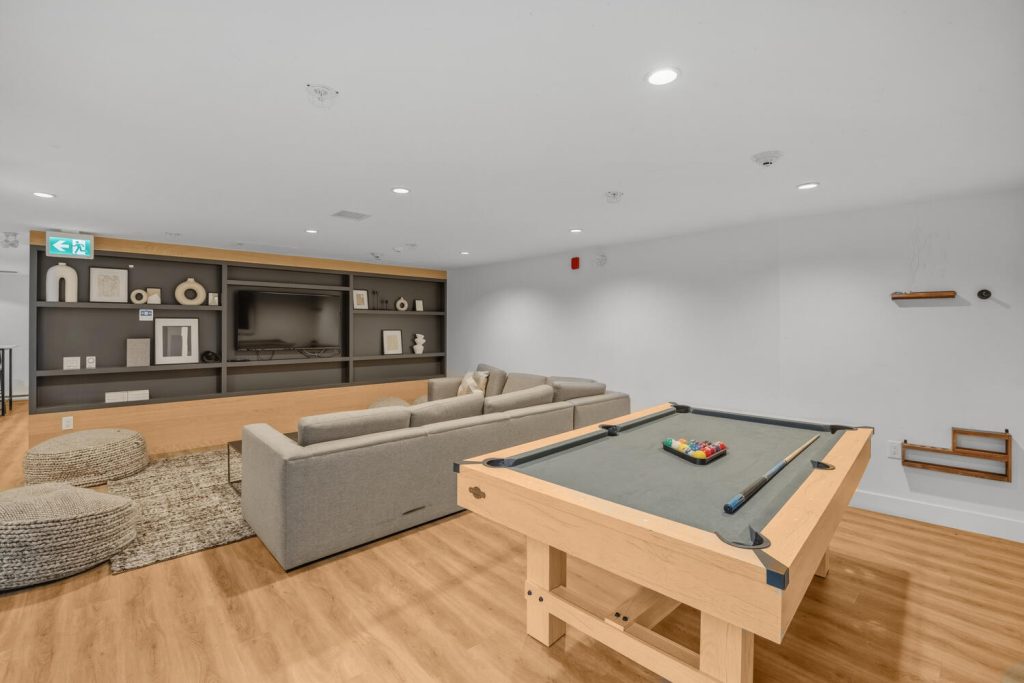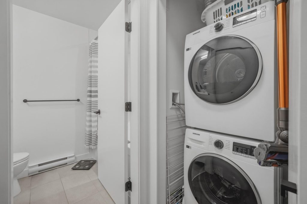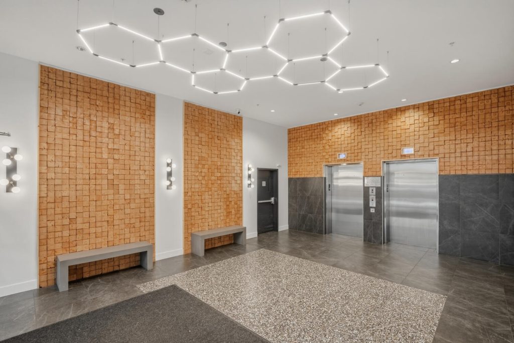 Welcome to The Clyde by Porte. A contemporary development in the heart of Port Moody Center. An impressive lobby welcomes you to the building before reaching your front door. Herringbone wood flooring in the foyer lead you to a gleaming kitchen with quartz counters surrounding stainless steel appliances including a gas range. The bright living room leads you to the partially covered sundeck with 180° north facing view towards the mountainous Belcarra Regional Park. The large primary bedroom has a full en suite & oversized glass enclosed shower. The second bedroom on the opposite side of the home shares the main full bathroom with a soaker tub. An open den off the foyer rounds out this versatile and thoughtful floor plan. Amenities include a fitness center, social lounge with kitchen, a game room, dog spa & the manicured courtyard. This home is just a 6 min walk to Skytrain and 19 min to Rocky Point Park or the Port Moody Rec Center, and is surrounded by restaurants and grocery stores. One parking, one locker and pets are welcome.