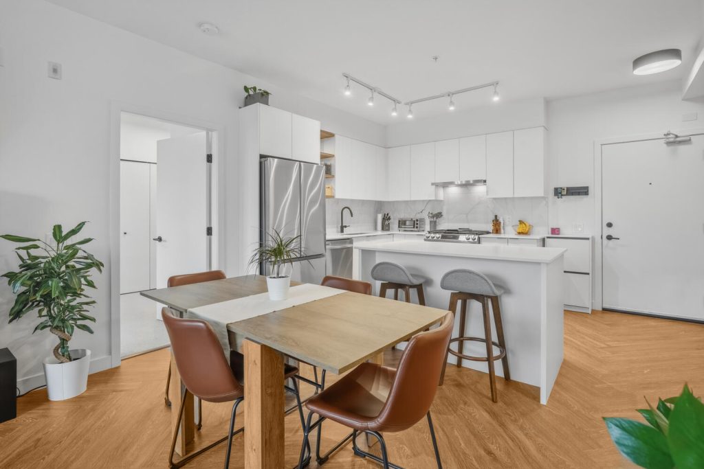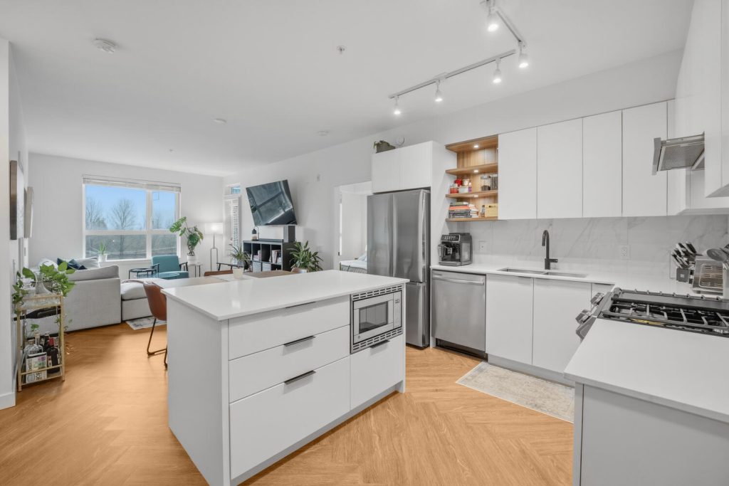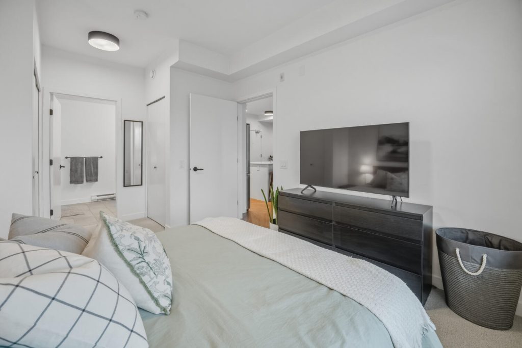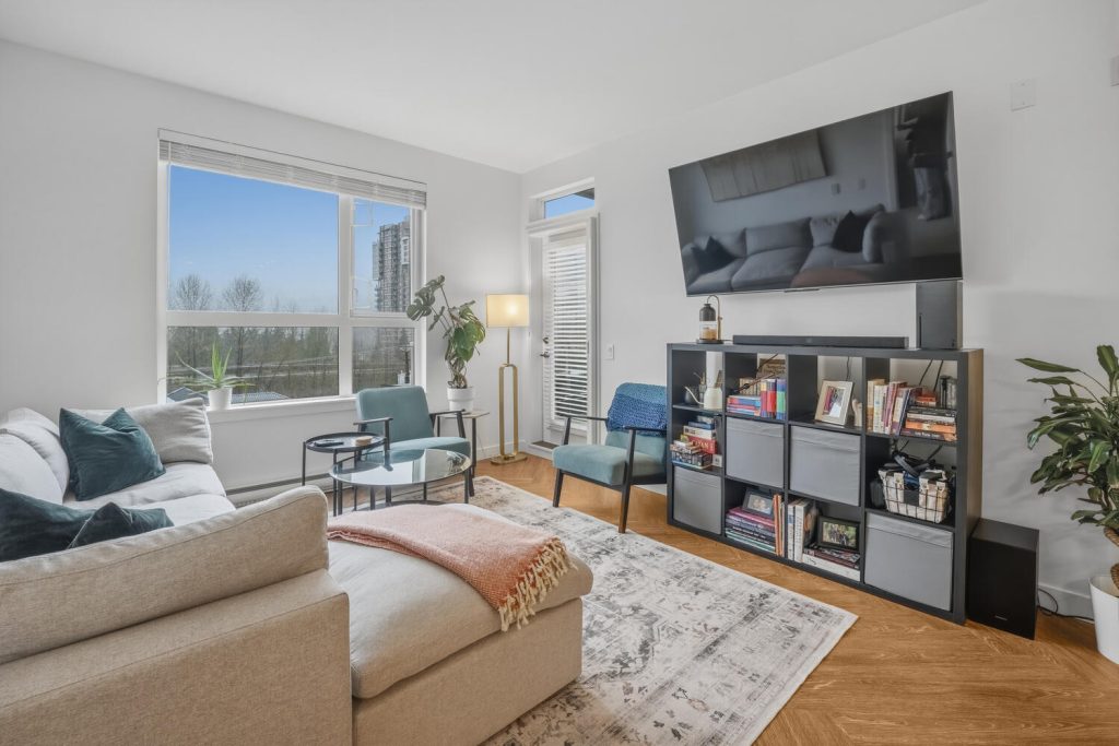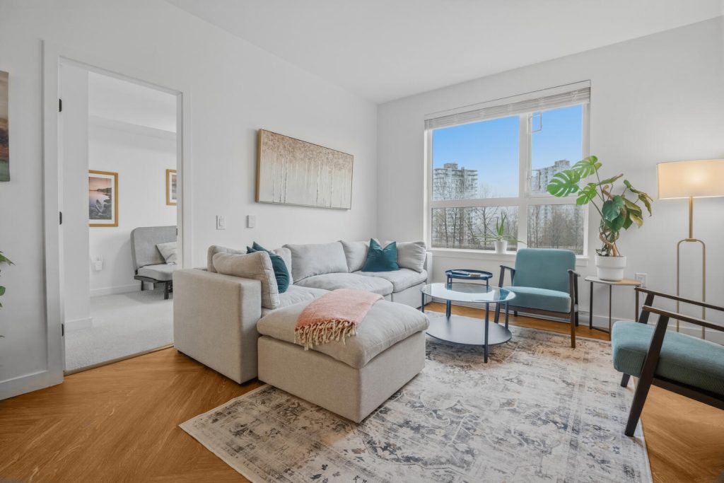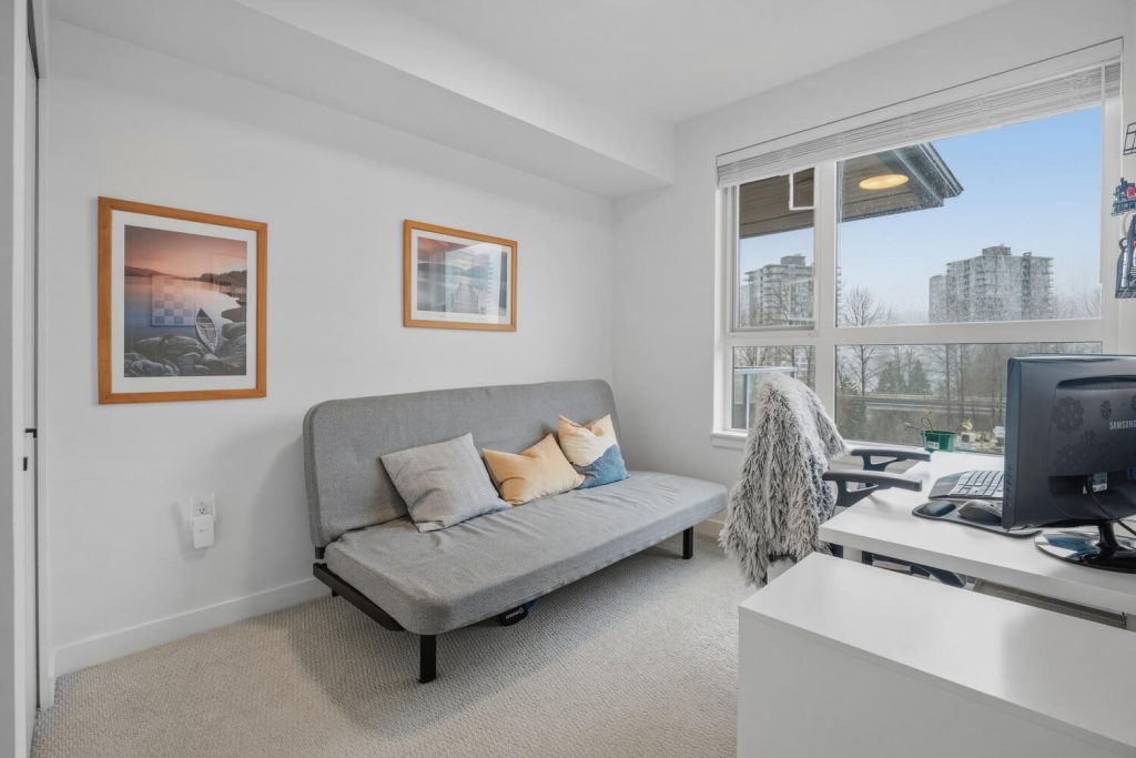 Welcome to The Clyde by Porte. A contemporary development in the heart of Port Moody Center. An impressive lobby welcomes you to the building before reaching your front door. Herringbone wood flooring in the foyer lead you to a gleaming kitchen with quartz counters surrounding stainless steel appliances including a gas range. The bright living room leads you to the partially covered sundeck with 180° north facing view towards the mountainous Belcarra Regional Park. The large primary bedroom has a full en suite & oversized glass enclosed shower. The second bedroom on the opposite side of the home shares the main full bathroom with a soaker tub. An open den off the foyer rounds out this versatile and thoughtful floor plan. Amenities include a fitness center, social lounge with kitchen, a game room, dog spa & the manicured courtyard. This home is just a 6 min walk to Skytrain and 19 min to Rocky Point Park or the Port Moody Rec Center, and is surrounded by restaurants and grocery stores. One parking, one locker and pets are welcome.