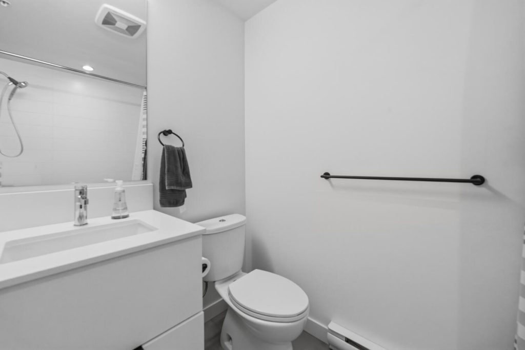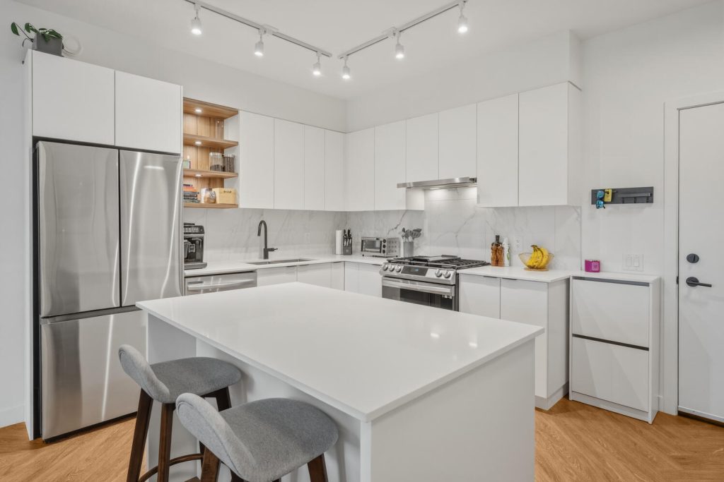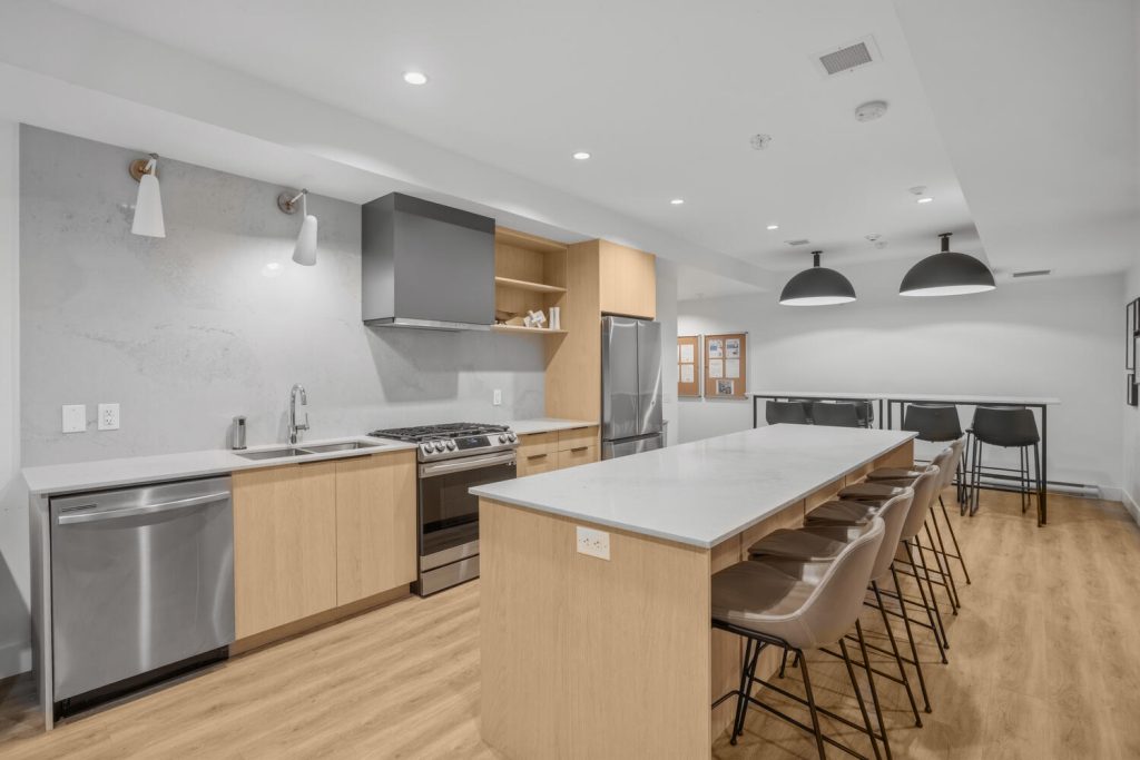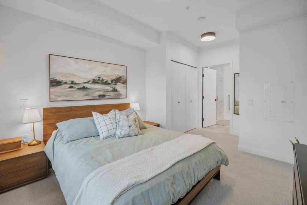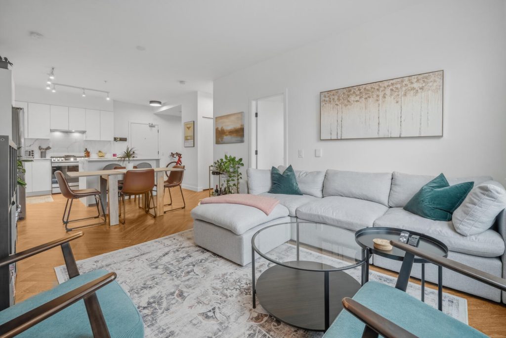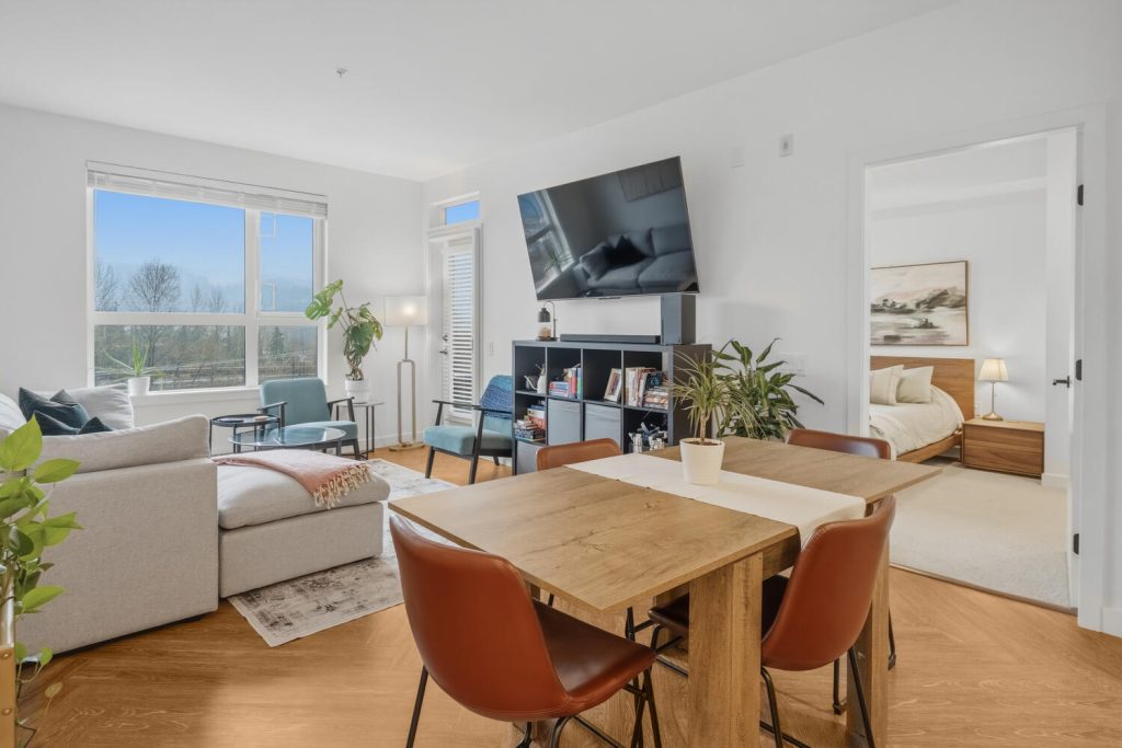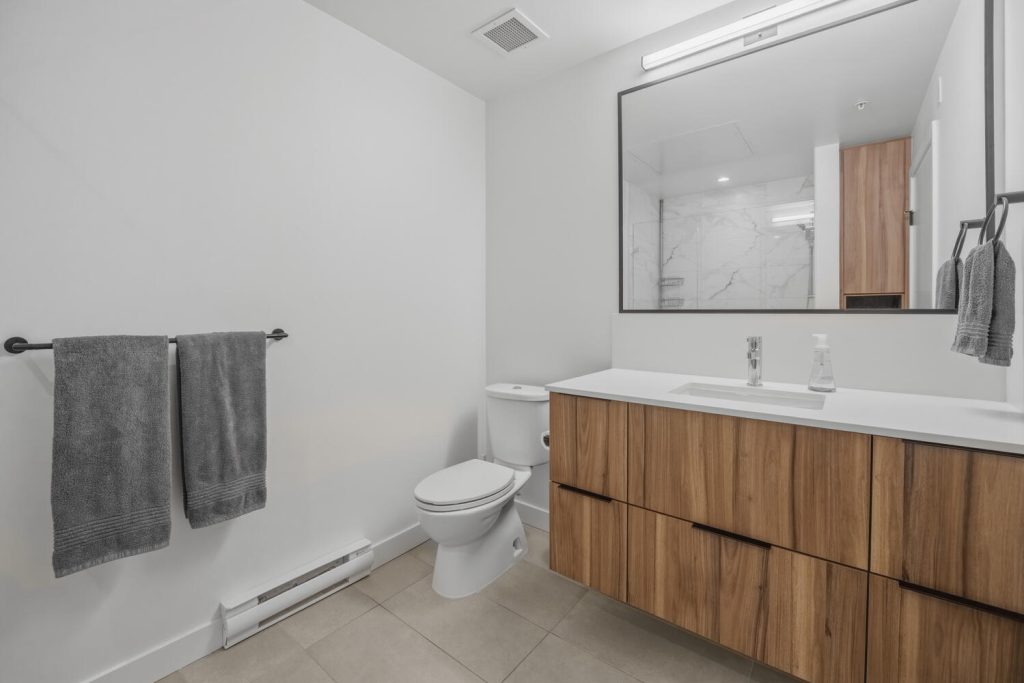 Welcome to The Clyde by Porte. A contemporary development in the heart of Port Moody Center. An impressive lobby welcomes you to the building before reaching your front door. Herringbone wood flooring in the foyer lead you to a gleaming kitchen with quartz counters surrounding stainless steel appliances including a gas range. The bright living room leads you to the partially covered sundeck with 180° north facing view towards the mountainous Belcarra Regional Park. The large primary bedroom has a full en suite & oversized glass enclosed shower. The second bedroom on the opposite side of the home shares the main full bathroom with a soaker tub. An open den off the foyer rounds out this versatile and thoughtful floor plan. Amenities include a fitness center, social lounge with kitchen, a game room, dog spa & the manicured courtyard. This home is just a 6 min walk to Skytrain and 19 min to Rocky Point Park or the Port Moody Rec Center, and is surrounded by restaurants and grocery stores. One parking, one locker and pets are welcome.